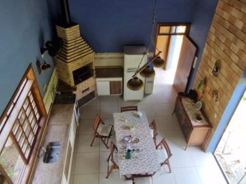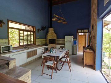 Lazer na Cozinha: Cozinha espaçosa com churrasqueira, fogão e forno a lenha, perfeita para receber.