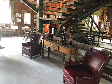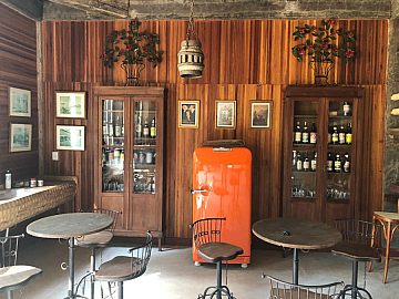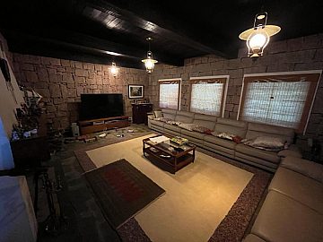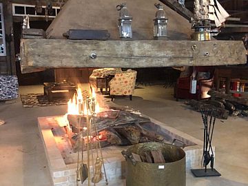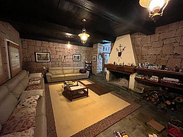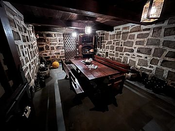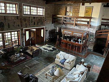 Gastronomia: Sala de jantar para 14 pessoas, cozinha de 35 m² com fogão à lenha.