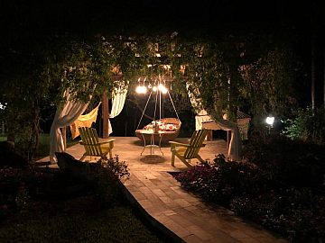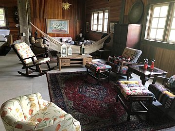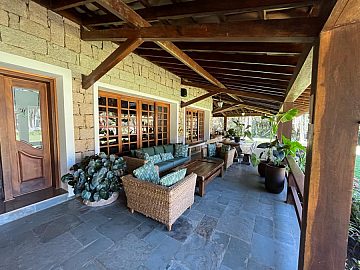 Varanda Gourmet: Ampla varanda com fogão à lenha, mesa para 20 pessoas e 2 ambientes de estar com sofás.