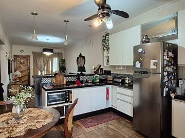 Sala integrada a uma belíssima cozinha americana com ventilador de teto e móveis planejados de alto padrão.