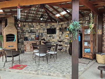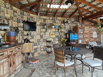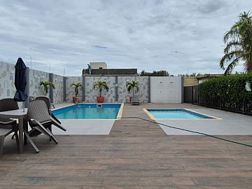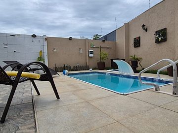 Área gourmet com churrasquiera e piscina IGUI com sistema de aquecimento.