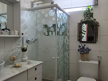 Banheiro social amplo com box de blindex e planejado