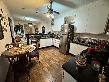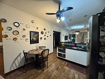 Sala integrada a uma belíssima cozinha americana com ventilador de teto e móveis planejados de alto padrão.