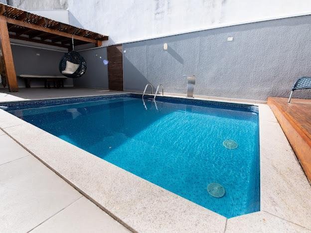 - Deck e Piscina: Área externa com deck, chaise redonda, espreguiçadeiras, piscina com aquecedor solar, cascata e hidromassagem, garantindo lazer e diversão.